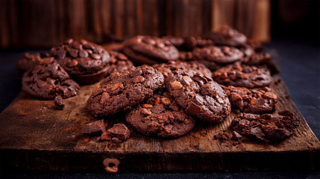 Galletas caseras doble chocolate, intensas y suaves, ideales para acompañar café o cacao caliente.